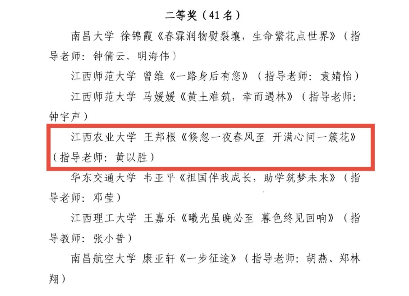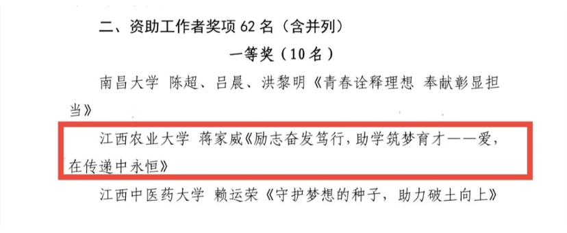 近日,江西省教育厅公布第五届“筑梦飞翔·资助伴我成长”主题征文活动获奖结果,学校获得一等奖1项,二等奖1项,并连续五年荣获“优秀组织奖”。推荐的教师征文《励志奋发笃行,助学筑梦育才——爱,在传递中永恒》(作者:蒋家威)荣获一等奖;研究生征文《倏忽一夜春风至 开满心间一簇花》(作者:王邦根,指导老师:黄以胜)荣获二等奖。