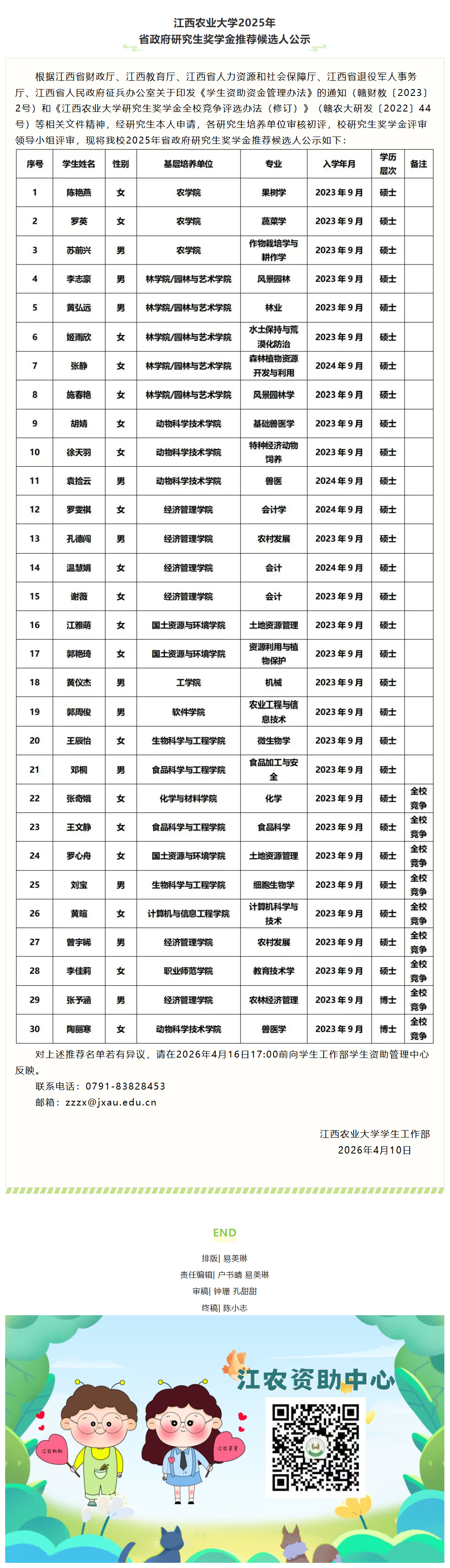 江西农业大学2025年省政府研究生奖学金推荐候选人公示